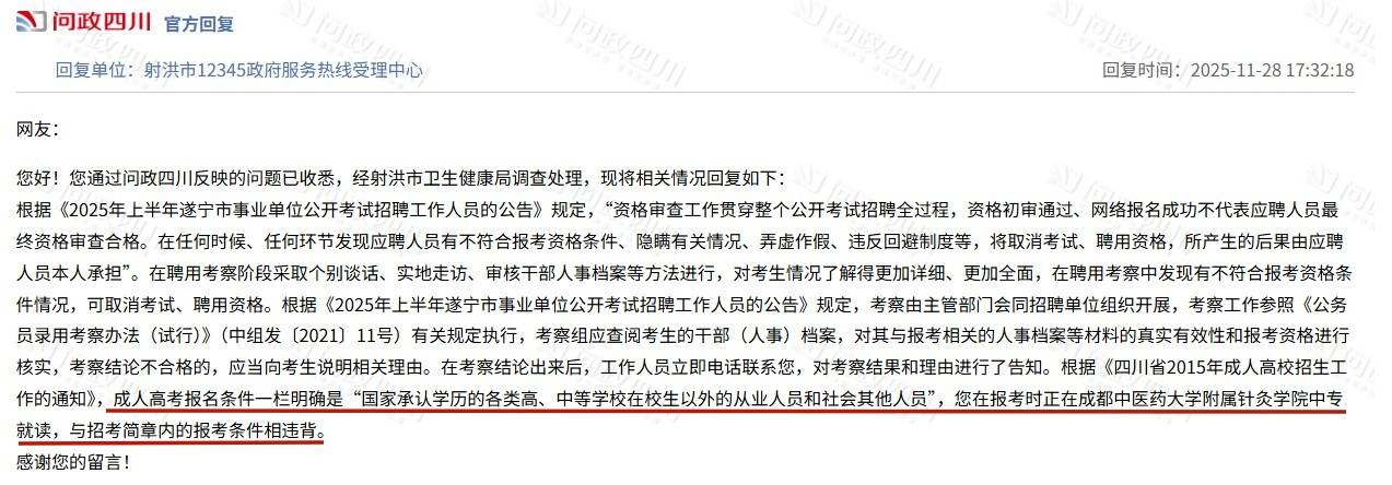 11月28日,射洪市“12345”回复表示,税女士当时正在中专就读,不符合当年四川成人高考规定的“在校生以外人员”报名条件。根据此次招聘规定,考察组已告知税女士考察结果和理由。