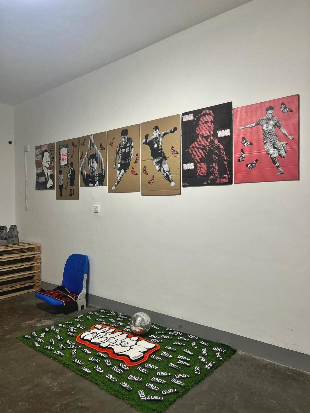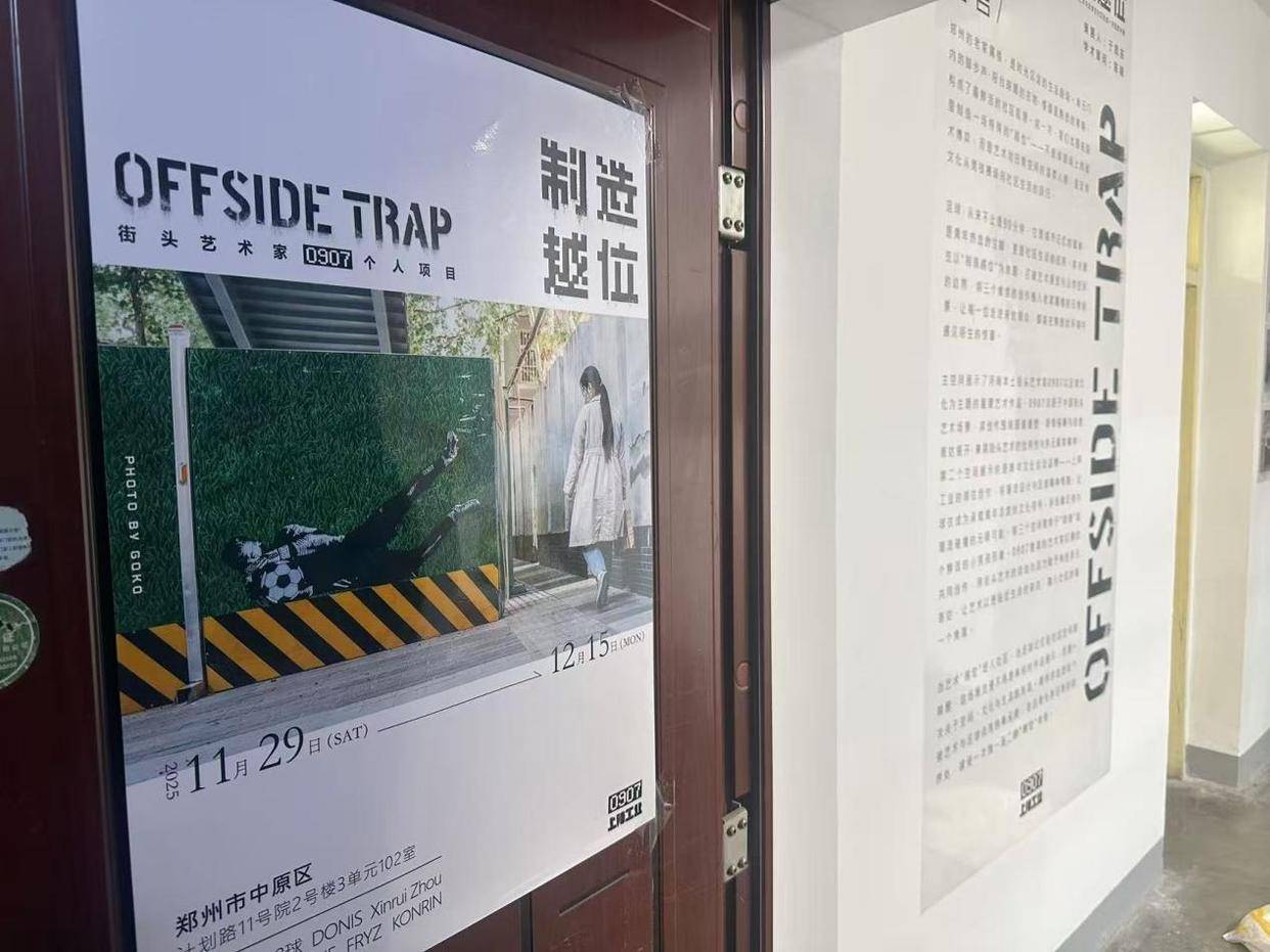 作为本赛季最后一个压轴赛事,12月6日,河南队将出战今年与北京国安的足协杯决赛,冲击队史首个全国冠军。为了配合中原足球冲击历史性时刻,近日,河南本土街头艺术家0907在郑州一处居民楼内围绕河南足球,举办了一场名为“制造越位”的主题展览。