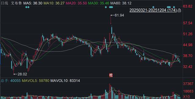 二级市场上,截至12月4日收盘,艾布鲁下跌1.86%报34.76元/股,总市值约54.23亿元,今年来公司股价累计下跌近三成。