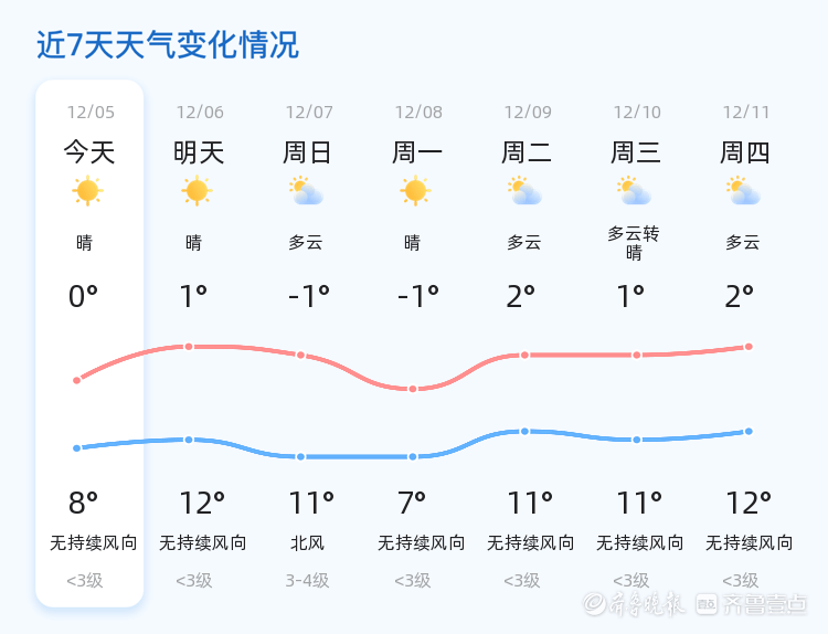 预计明天(12月6日)东营市仍将以晴朗天气为主,气温较今日有所回升,最高气温可达12℃,最低气温1℃。风力较小,适合市民户外活动。