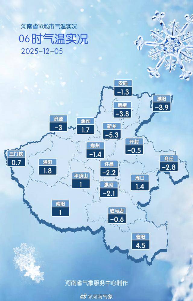 大象新闻记者12月5日从河南气象了解到,今天白天到夜里,全省晴天间多云。 全省偏南风3级左右,北部阵风6级左右。 最高气温:南部12到14℃;其他县(市、区)10到12℃。 最低气温:西部山区、北部零下3℃到零下1℃;东南部3到5℃;其他县(市、区)0℃左右。