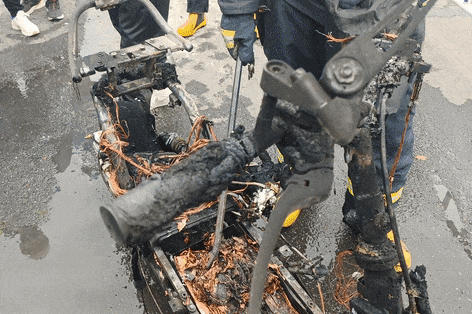 火灾导致现场5辆电动自行车被烧得只剩框架,2辆车身部件扭曲变形,整栋楼外墙被熏得黢黑。据了解,本次火灾由违规改装的电动自行车电池,在飞线充电的过程中发生故障引发。