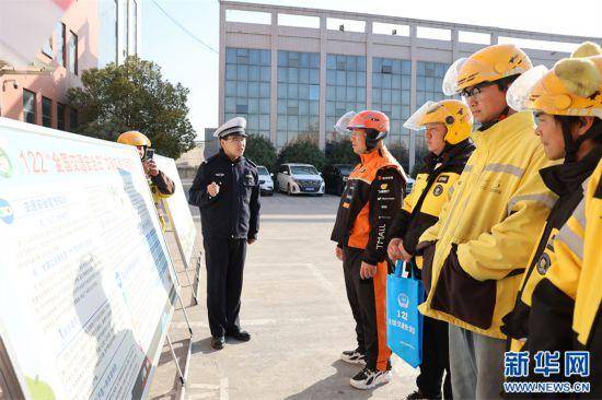 12月2日,新乡市辉县市举行“全国交通安全日”主题活动,交警正在现场向外卖配送员讲解交通安全知识。魏冬浩 摄