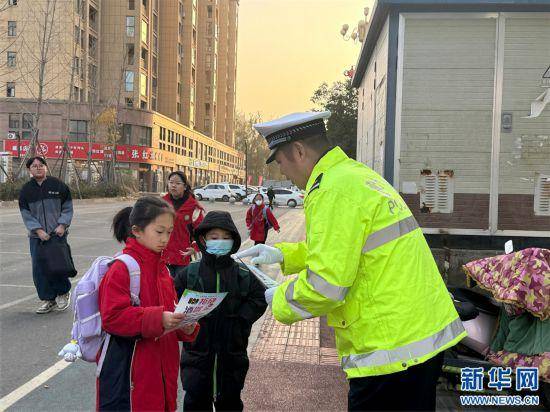 12月1日,在许昌市襄城县,交警正在向学生发放宣传资料并讲解交通安全知识。刘璐 摄