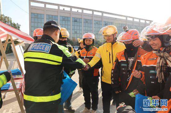 12月2日,在新乡市辉县市“全国交通安全日”启动仪式上,交警向外卖员发放反光背带。魏冬浩 摄