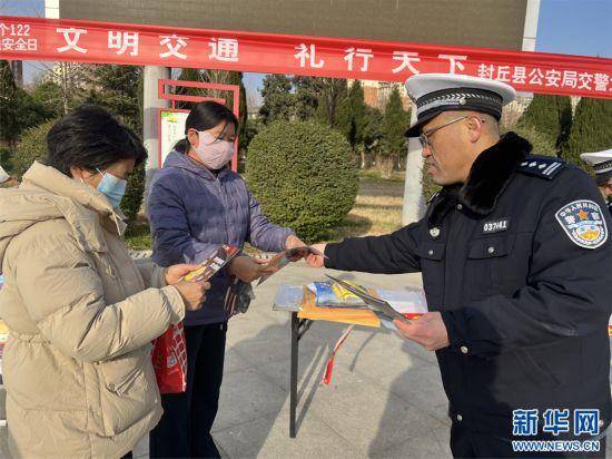 12月2日,新乡市封丘县开展“全国交通安全日”宣传活动,交警正在向群众发放宣传资料并讲解安全出行知识。靳润婷 摄