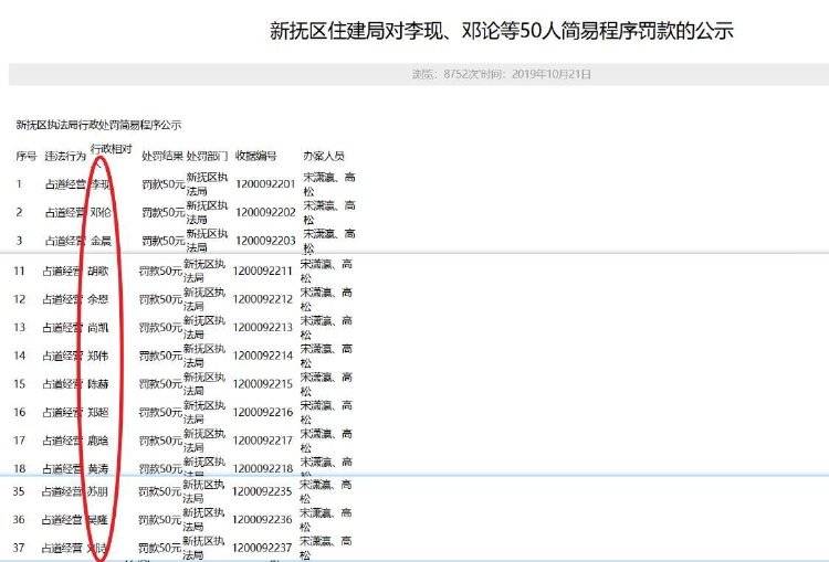 极目新闻消息,12月4日,有网友发现辽宁抚顺新抚区住建局于2019年10月21日公示的一占道经营处罚名单疑存猫腻,名单上的名字不但均为“姓氏+单名”的两字结构,而且还不少与知名艺人重名,如鹿晗、孙俪、李现、邓伦、金晨、董璇、杨颖等。另有一些被处罚人员的名字,虽然与知名艺人名字不是完全重合,但也仅仅是一字之差,例如“苏朋”“吴隆”“林志”等