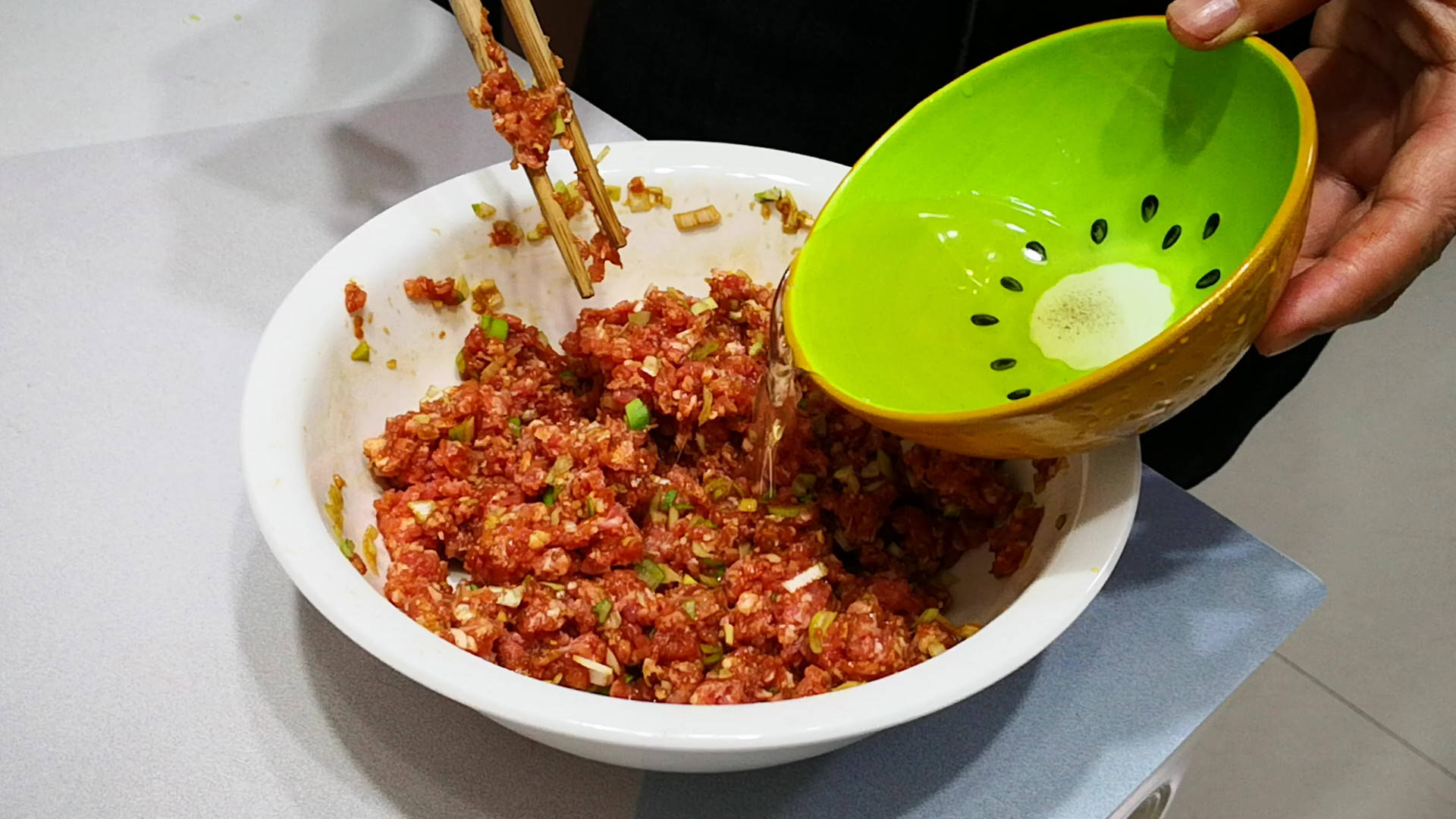 然后再分3次倒入提前泡好的葱姜水,每倒入一次都要用筷子充分搅拌至肉馅完全吸收,这样调好的肉馅会更水润多汁。
