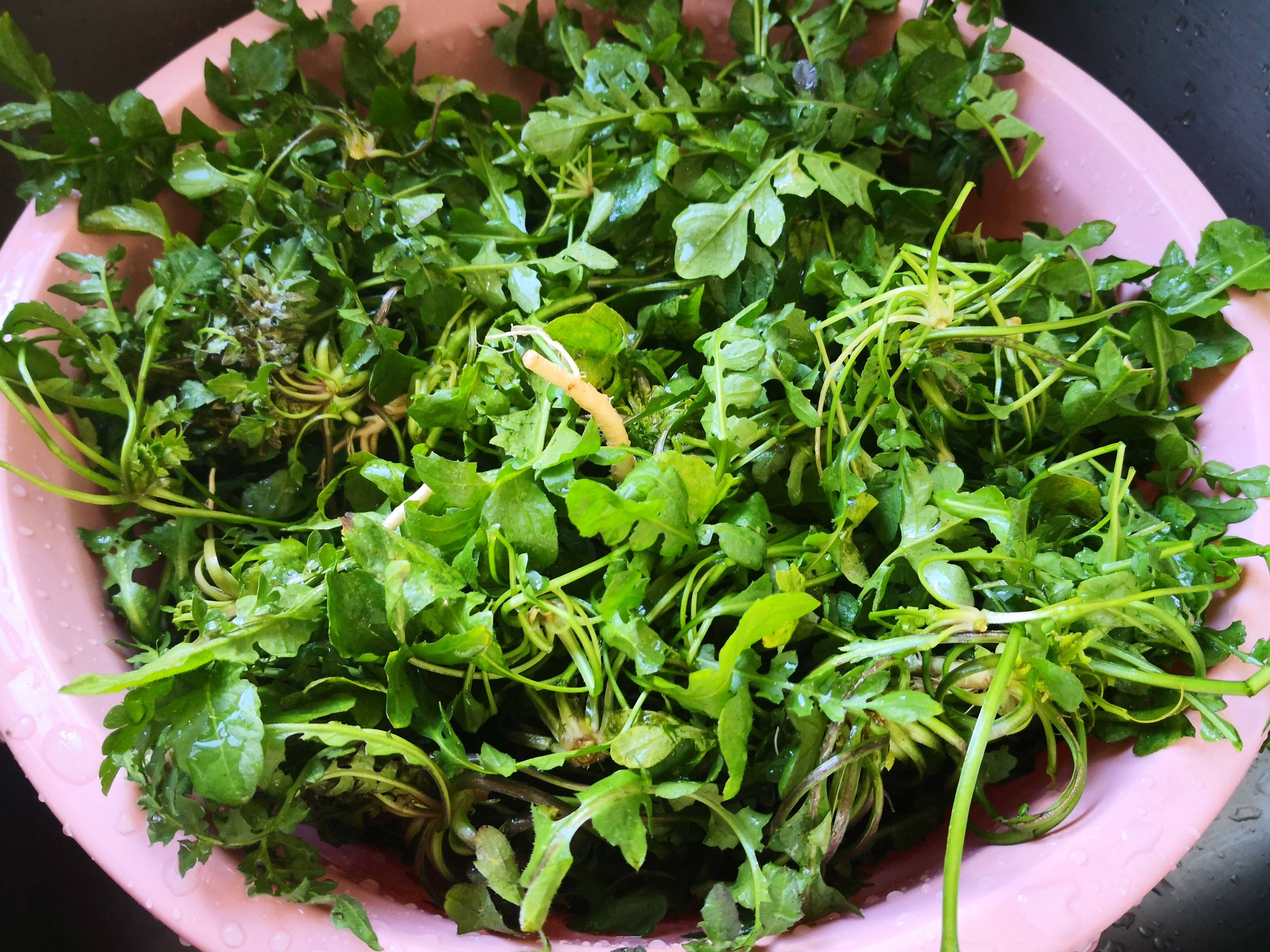1.先将荠菜的老根和黄叶摘掉,用流动的清水多冲洗几遍,荠菜的缝隙中很容易藏泥沙,清洗时要仔细。