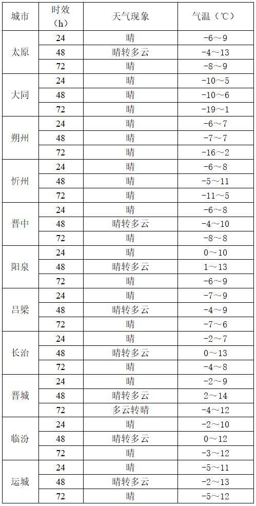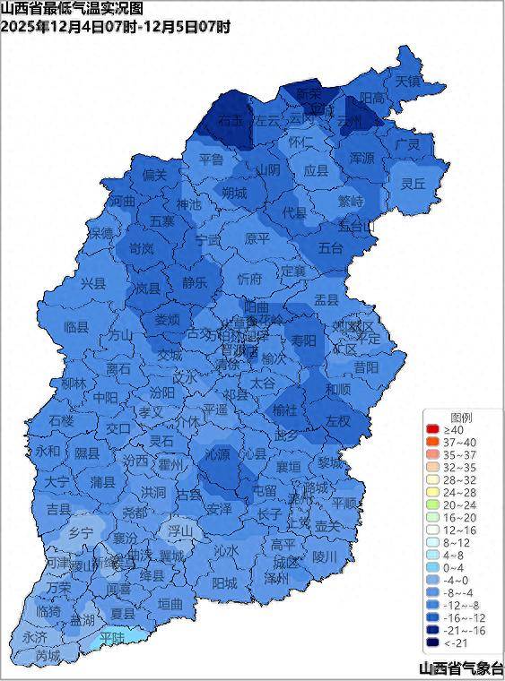 12月4日07时至5日07时,全省各地最低气温介于-18.8℃(右玉)~0.8℃(平陆)之间。太原、大同、阳泉、长治、晋城、朔州、晋中、忻州、临汾和吕梁的全域,运城的大部共116个县(市、区)最低气温在0℃以下,其中,应县、榆次区、屯留区、武乡、忻府区、太谷区、安泽、长子、保德、沁县、繁峙、方山、襄垣、古交、中阳、灵丘、兴县、蒲县、定襄、平鲁区、和顺、山阴、阳高、天镇、代县、小店区、榆社、娄烦、岚县、阳曲、左云、朔城区、寿阳、河曲、偏关、沁源、五寨、静乐、广灵、浑源、云冈区、五台、左权、岢岚、平城区、云州区、新荣区、右玉共48个县(市、区)在-10℃以下。
