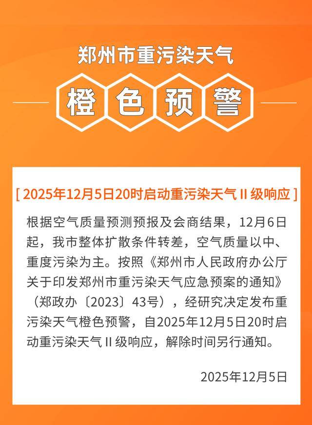 12月6日,记者从郑州市生态环境保护工作专班污染防治攻坚办公室获悉,郑州将于今日20时启动重污染天气Ⅱ级响应,解除时间另行通知。