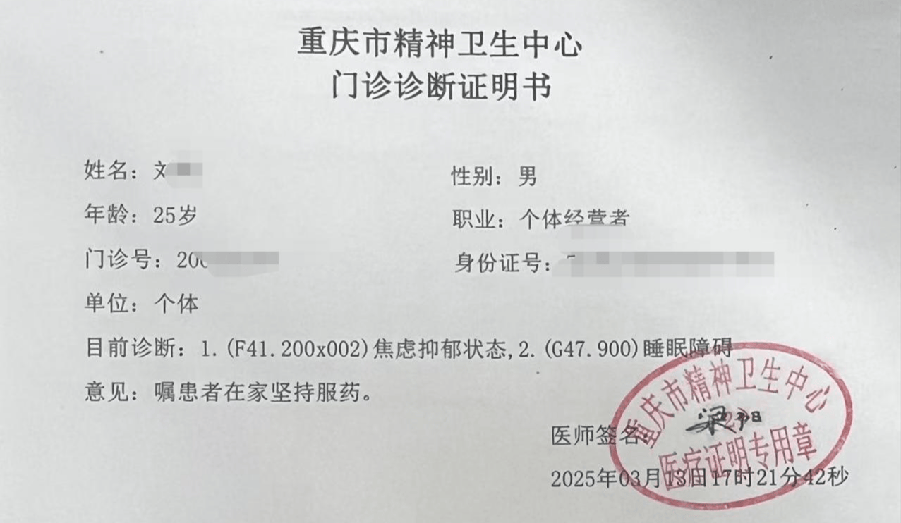 ▲刘先生的焦虑抑郁诊断证明书