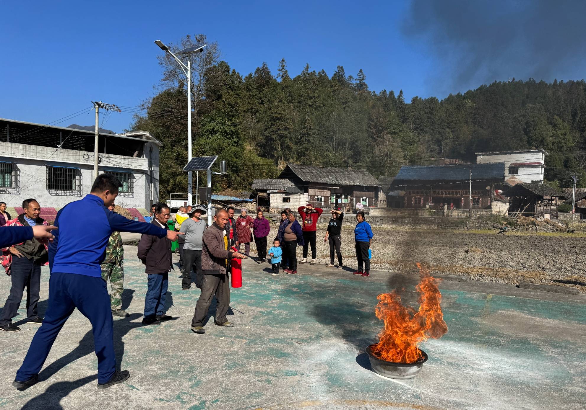 “遇到火灾不要慌,弯腰低姿捂口鼻,沿着疏散通道快速撤离……”在斗篷山木房集中自然寨的消防演练现场,专职消防队员正手把手向群众示范浓烟环境下的疏散逃生方法。