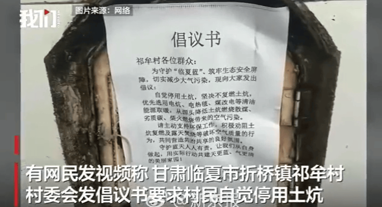 12月5日,有网民发视频称,甘肃临夏市折桥镇祁牟村村委会发倡议书,要求村民自觉停用土炕。倡议书称,为减少大气污染,向村民发出倡议,优先选用电炕、电热毯等清洁能源取暖。