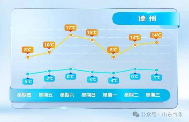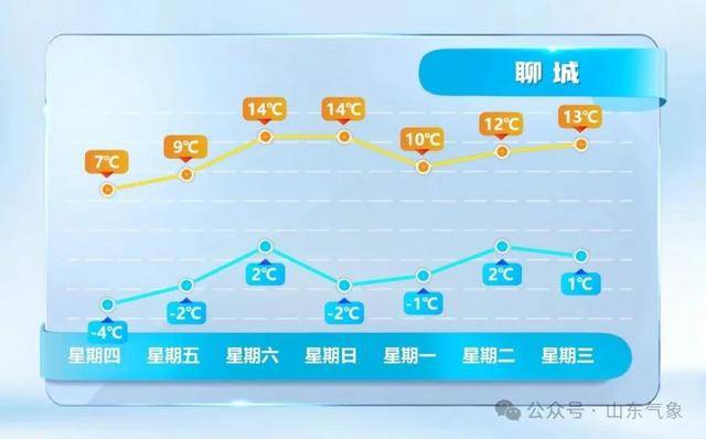 最低气温:聊城、德州和菏泽4℃左右,半岛内陆地区-1℃左右,其他地区2℃左右。