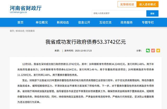 12月5日,据河南省财政厅消息,河南在深圳成功发行政府债券53.3742亿元,其中:30年期新增专项债券34.2249亿元,发行利率2.48%,用于补充政府性基金财力;20年期新增专项债券8.0234亿元,发行利率2.49%,用于存量政府投资项目;20年期再融资专项债券11.1259亿元,发行利率2.48%,用于置换存量隐性债务。