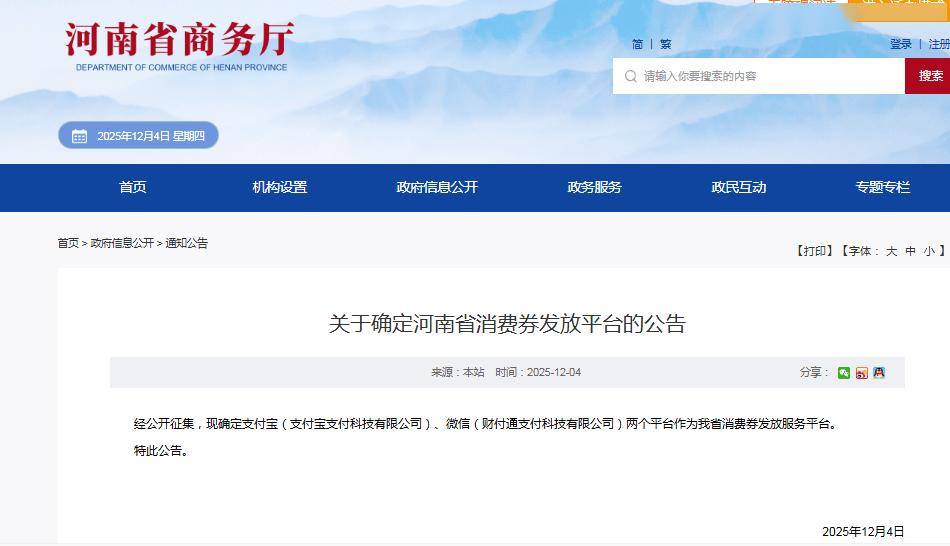 12月4日,河南省商务厅发布公告,确定支付宝(支付宝支付科技有限公司)、微信(财付通支付科技有限公司)两个平台作为河南省消费券发放服务平台。