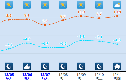 全市晴天,最低气温-7~-2℃,最高气温6~10℃。