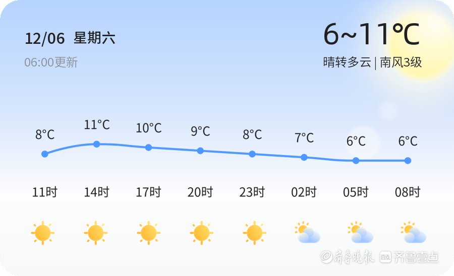 今天是12月6日,星期六,农历十月十七。青岛市今天天气晴转多云,气温适宜,最高气温11℃,最低气温6℃,南风3级,空气湿度55%,PM2.5指数59。各区天气情况基本一致,以晴到多云为主,温差不大,市民可以正常出行。