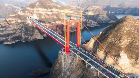 黄河三峡大桥地处河南济源与新安交界的王屋山-黛眉山世界地质公园,桥梁主跨555米,一跨跨越黄河小浪底库区。作为济源至新安高速公路的控制性工程,大桥建成通车后,两岸通行时长将由两小时缩短至二十分钟。