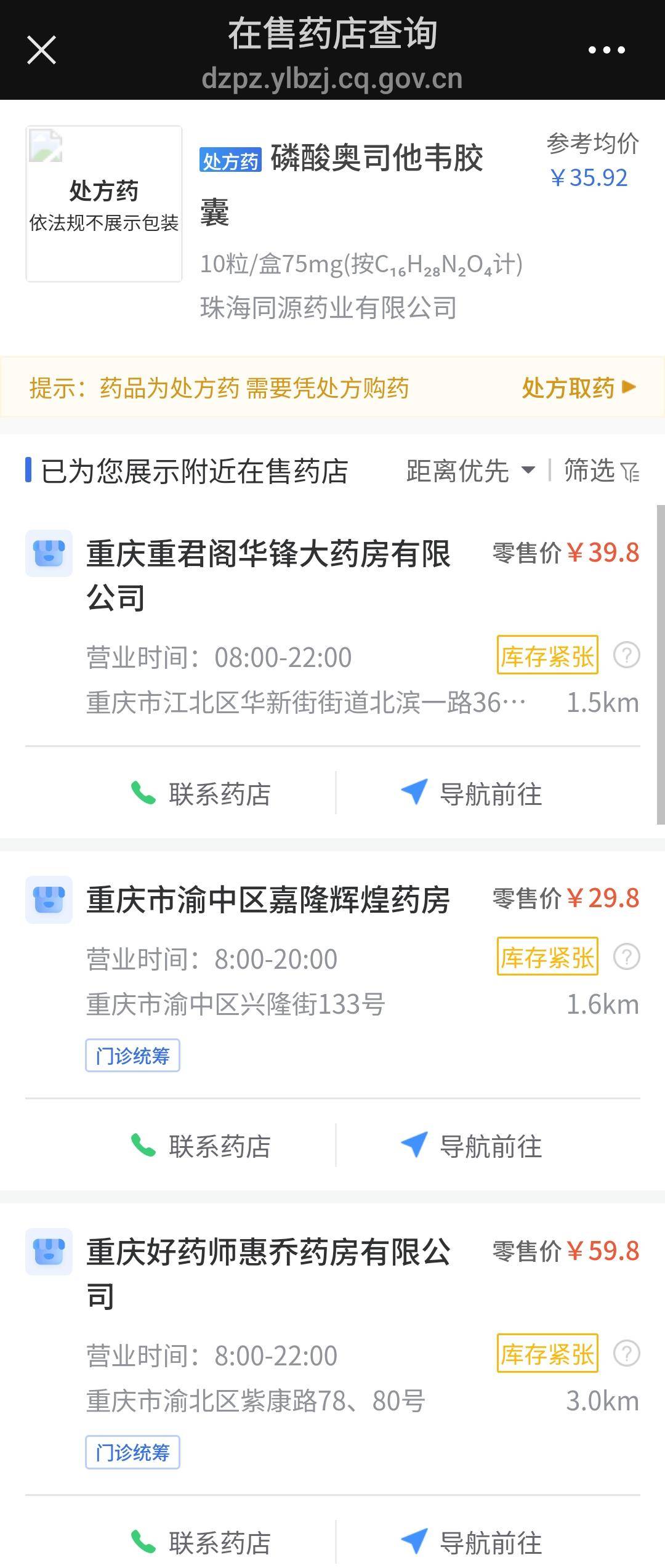 4日,红星新闻在重庆市医保局推出的医保定点药店比价平台“药价智慧比”上查询到,珠海同源药业的磷酸奥司他韦胶囊10粒装,共82家在售,参考均价为35.92元,最低14元,最高68元。该平台目前未上线医院比价功能。同时,查询外卖平台(“即时达”),该药在重庆线下药店价格最低为18元。