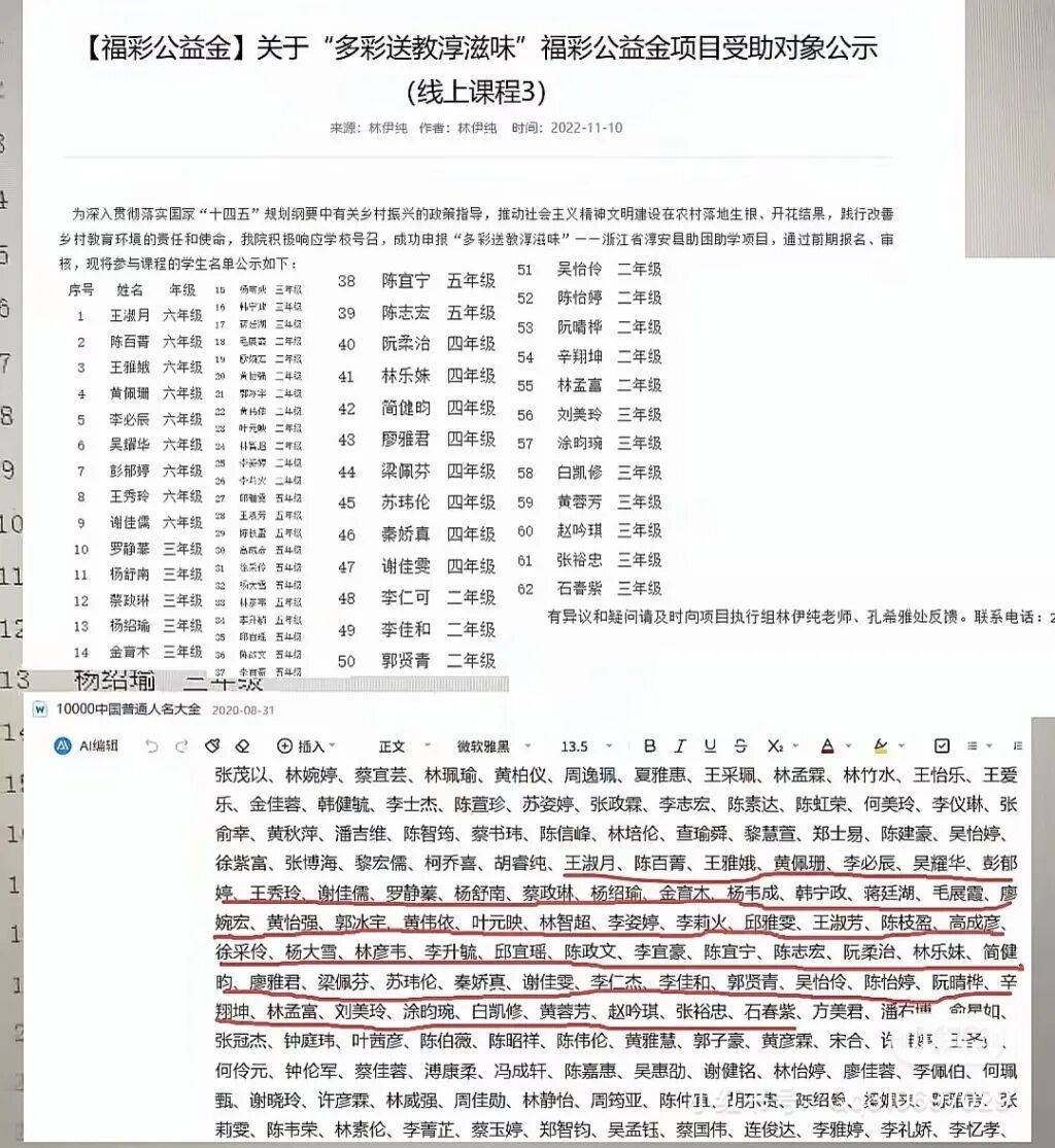 12月5日,有网友反映杭州师范大学人文学院于2022年公布的《【福彩公益金】关于“多彩送教淳滋味”福彩公益金项目受助对象公示(线上课程3)》名单,其中多人与百度文库中一份名为《10000中国普通人名大全》文档的姓名及排序完全吻合。