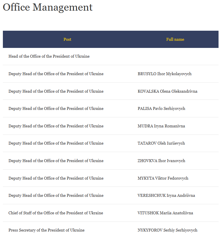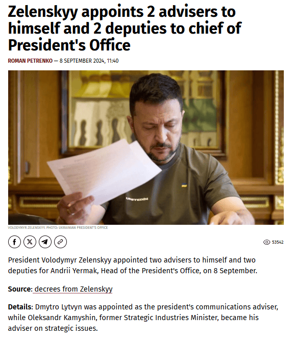 2024年9月,泽连斯基曾以总统令的形式任命德米特罗·利特温(Dmytro Lytvyn)和亚历山大·卡米申(Oleksandr Kamyshin)分别作为其通讯顾问和战略事务顾问,同时将前外喀尔巴阡州州长维克托·米基塔(Viktor Mykyta)和前副总理伊琳娜·维列舒克(Iryna Vereshchuk)任命为总统办公室副主任,作为时任办公室主任叶尔马克(Andriy Yermak)的副手。