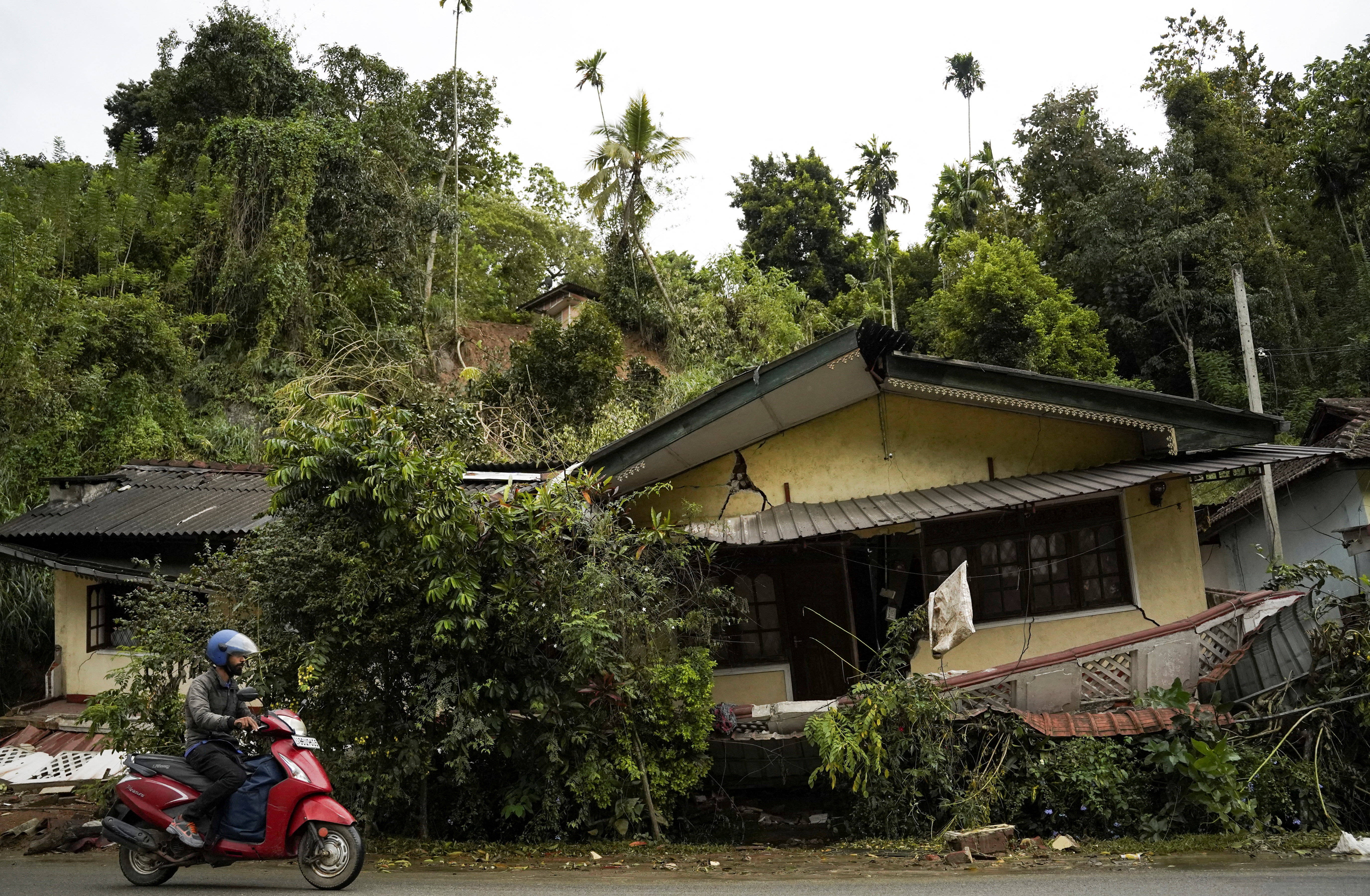 12月5日,在斯里兰卡康提,一名男子骑车经过一栋受损的房屋。 新华社/路透