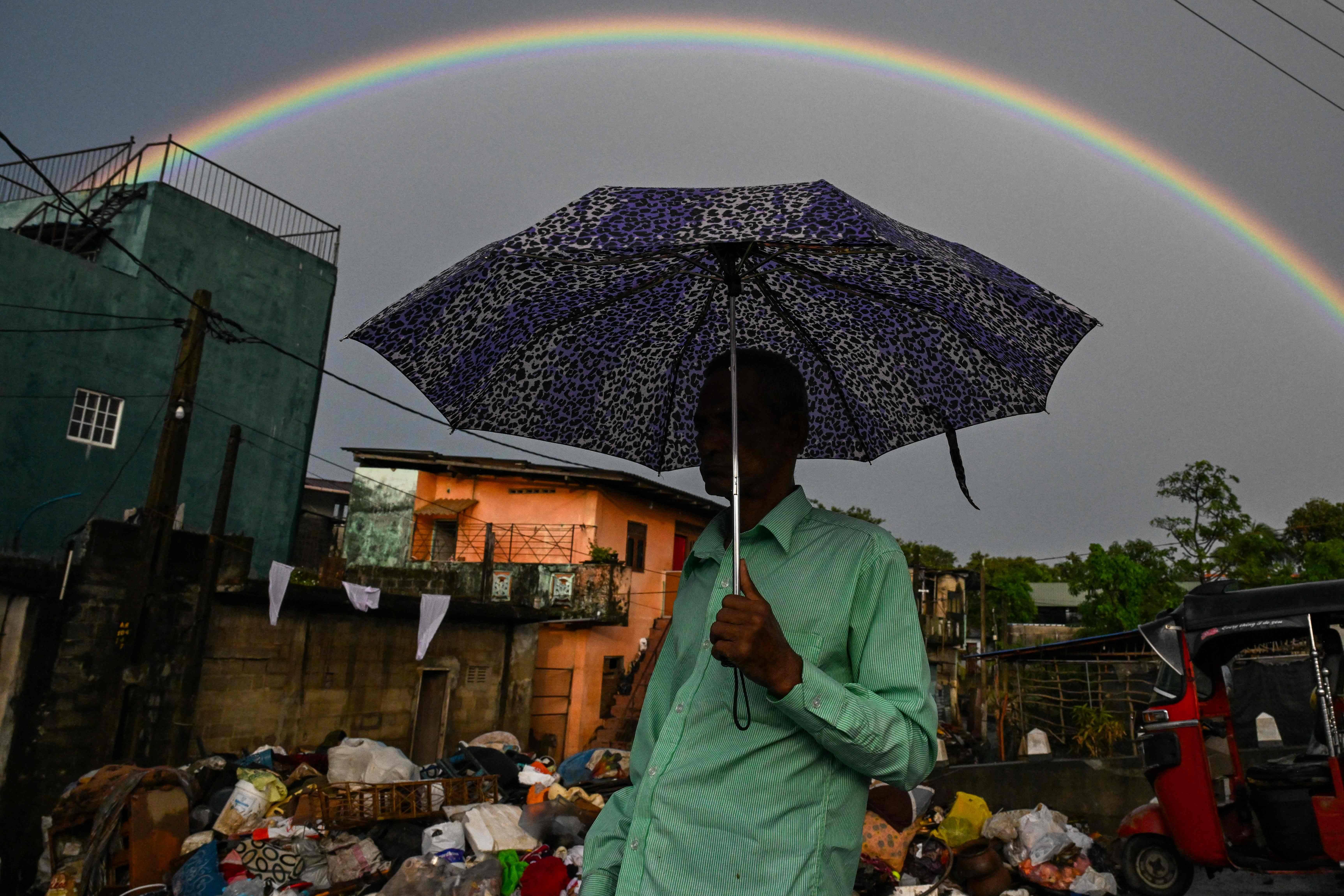 12月5日,在斯里兰卡科伦坡近郊,一名男子撑伞走过受损的民居。 新华社/法新