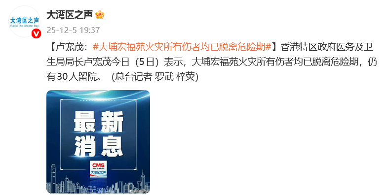 @大湾区之声:香港特区政府医务及卫生局局长卢宠茂今日(5日)表示, 大埔宏福苑火灾所有伤者均已脱离危险期,仍有30人留院。