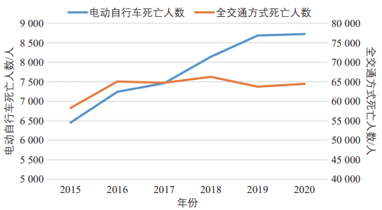 从下面这个图就可以看明白,在 2015-2020 年之间,电动自行车交通事故死亡人数从 6453 人增加到了 8724 人,年均增幅达到 5.1% ,远超全部交通死亡数据数据的 1.7% 。