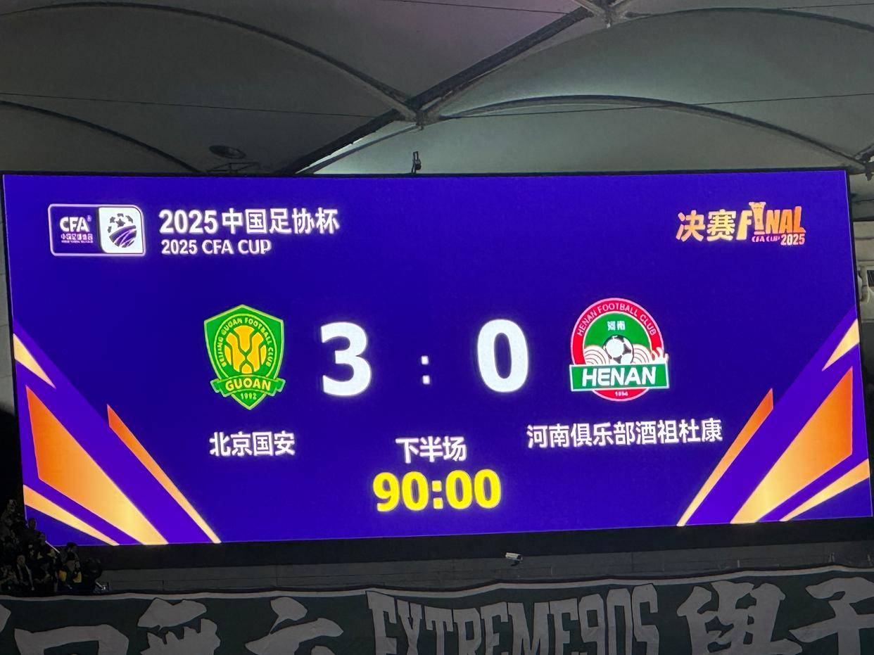 2025年足协杯决赛刚刚在苏州奥体中心体育场结束,90分钟的比赛中,河南俱乐部酒祖杜康队以0∶3负于北京国安,无缘冠军。