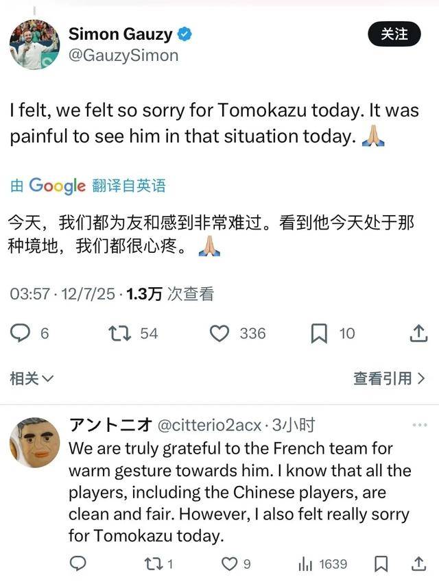 直到2025年成都混团世界杯第二阶段循环赛,日本队7-8不敌法国队后,法国名将西蒙-高茨发文对张本智和表示同情,西蒙-高茨在看到网友发布的张本智和被观众喝倒彩的视频后评论道:“今天我们为张本智和感到难过,看到他处于这种境地,我们都很心疼。”