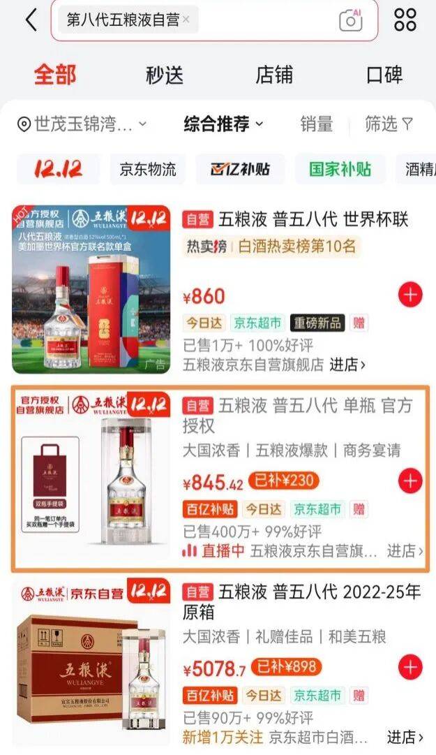 当前,价格倒挂已经成为白酒行业普遍现象。记者调查发现,目前天猫商城第八代五粮液价格多在820元/瓶~850元/瓶区间;京东自营价格在845元/瓶上下(含平台补贴)。