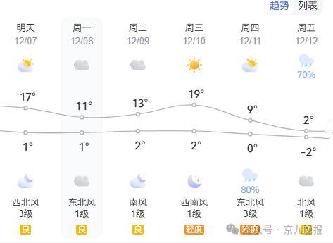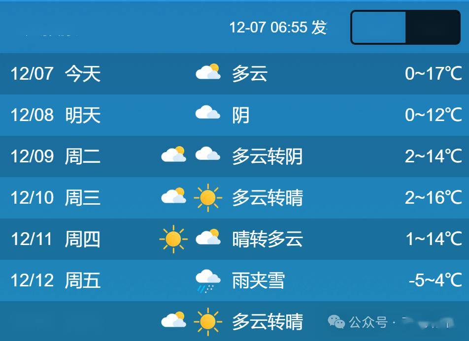 第一轮弱冷空气今天(12月7日)已经开始影响我省。今天下午到明天,全省风力将增至3到4级,中西部、西北部阵风可达6级左右。气温随之下降,西部地区首先出现4-6℃的降温。到下周一(12月8日),降温将覆盖全省,大部分地区降幅4-6℃,中西部和北部部分地区降幅6-8℃。