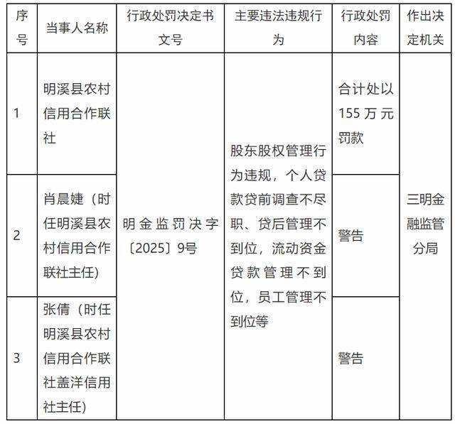 12月5日,三明金融监管分局行政处罚信息公示表显示,明溪县农村信用合作联社因“股东股权管理行为违规,个人贷款贷前调查不尽职、贷后管理不到位,流动资金贷款管理不到位,员工管理不到位等”,被处以罚款155万元;时任明溪县农村信用合作联社主任肖晨婕、时任明溪县农村信用合作联社盖洋信用社主任张倩,分别被给予警告处分。