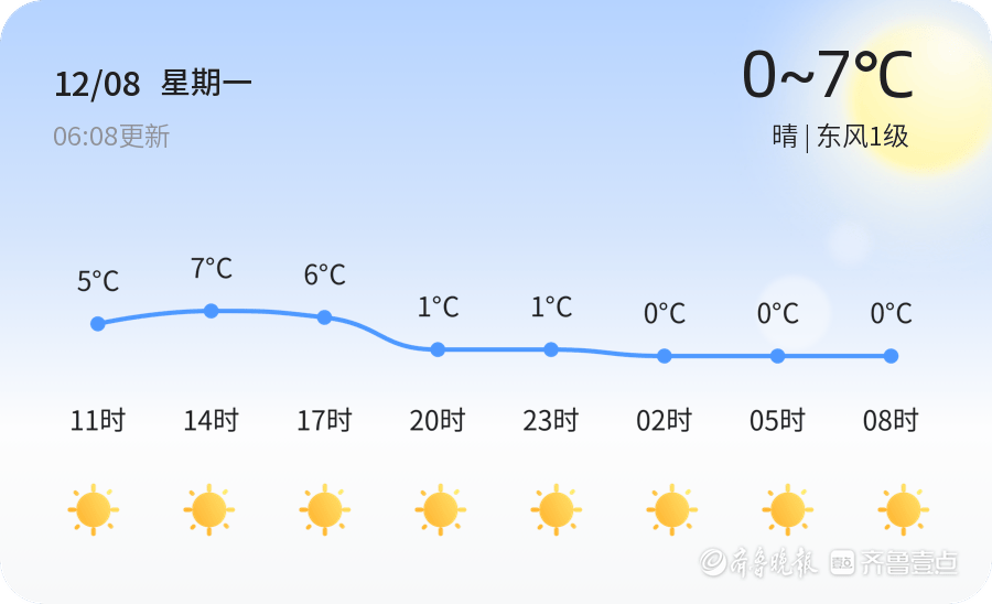 今日是12月8日,农历十月十九,星期一。德州市今日天气晴朗,气温较低,目前温度为-4.5℃,风向为东风1级,空气湿度为62%。PM2.5浓度为51微克/立方米,空气质量状况为良。今日气温预计最高将达到7℃,最低气温为0℃。由于早晨气温较低,市民出行时需注意和儿童等敏感人群,建议佩戴口罩,以防呼吸道疾病。此外,晴朗的天气适宜户外活动,但需注意防晒和保暖相结合。