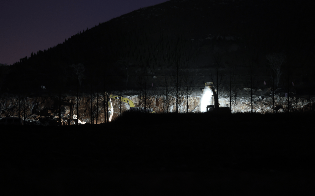 ▲11月28日晚8时,圣泉生态公司养殖场内两台铲车正在开采矿石。 新京报记者 李英强 摄