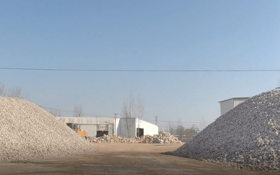 ▲11月29日,平邑县金星石材公司院内存放着圣泉生态公司卖来的原矿石(远处)和加工后的石子。新京报记者 李英强 摄