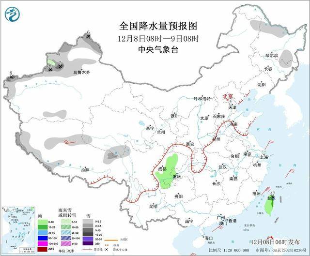 12月8日08时至9日08时,黑龙江北部和东南部、新疆北部、西藏中北部和西部、青海南部等地部分地区有小雪或雨夹雪,其中,新疆北疆北部和伊犁河谷等地部分地区有中到大雪(5~8毫米)。西南地区东北部、云南东北部、台湾岛等地部分地区有小到中雨,其中,台湾岛东北部局地有大雨(25~47毫米)。西藏中北部等地部分地区有4~6级风;东海西南部海域、台湾海峡、台湾以东洋面、巴士海峡、南海有6~7级风、阵风8~9级。