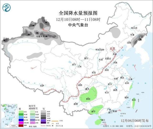 12月10日08时至11日08时,东北地区东部、新疆北部和南疆西部山区等地部分地区有小到中雪,其中,吉林东部、新疆北疆、伊犁河谷和南疆西部山区等地部分地区有大到暴雪(10~18毫米),阿勒泰、塔城、伊犁河谷等地部分地区24小时新增积雪深度超过10厘米,局地15~20厘米。重庆东南部、贵州大部、广西南部、海南岛、台湾岛东部等地部分地区有小雨。新疆北部、西藏北部等地部分地区有4~6级风;渤海、渤海海峡、黄海、台湾海峡、巴士海峡、南海有5~6级风、阵风7~8级。