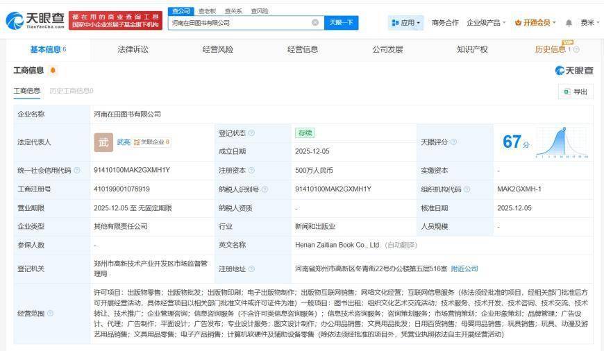 天眼查显示,近日,河南在田图书有限公司成立,法定代表人为武亮,注册资本500万人民币,经营范围包括出版物零售、出版物批发、出版物印刷等,由张雪峰(张子彪)全资持股的苏州峰阅万卷文化图书有限公司、河南高烁文化科技有限公司共同持股。