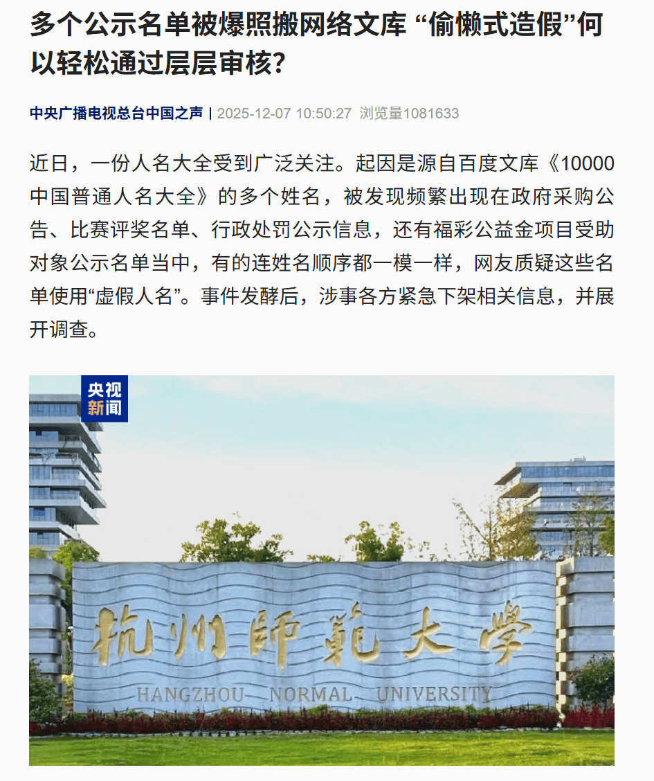此外,中央广播电视总台中国之声7日刊发报道《多个公示名单被爆照搬网络文库 “偷懒式造假”何以轻松通过层层审核?》指出,从政务采购到商业比赛,假名单不仅挑战着程序正义,更透支着社会公众的信任根基。