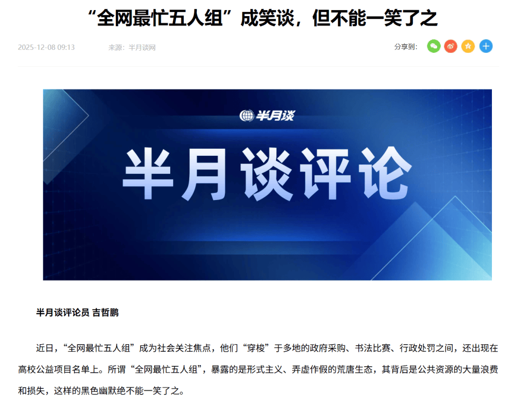 半月谈则在12月8日刊文直言,所谓“全网最忙五人组”,暴露的是形式主义、弄虚作假的荒唐生态,其背后是公共资源的大量浪费和损失,这样的黑色幽默绝不能一笑了之。