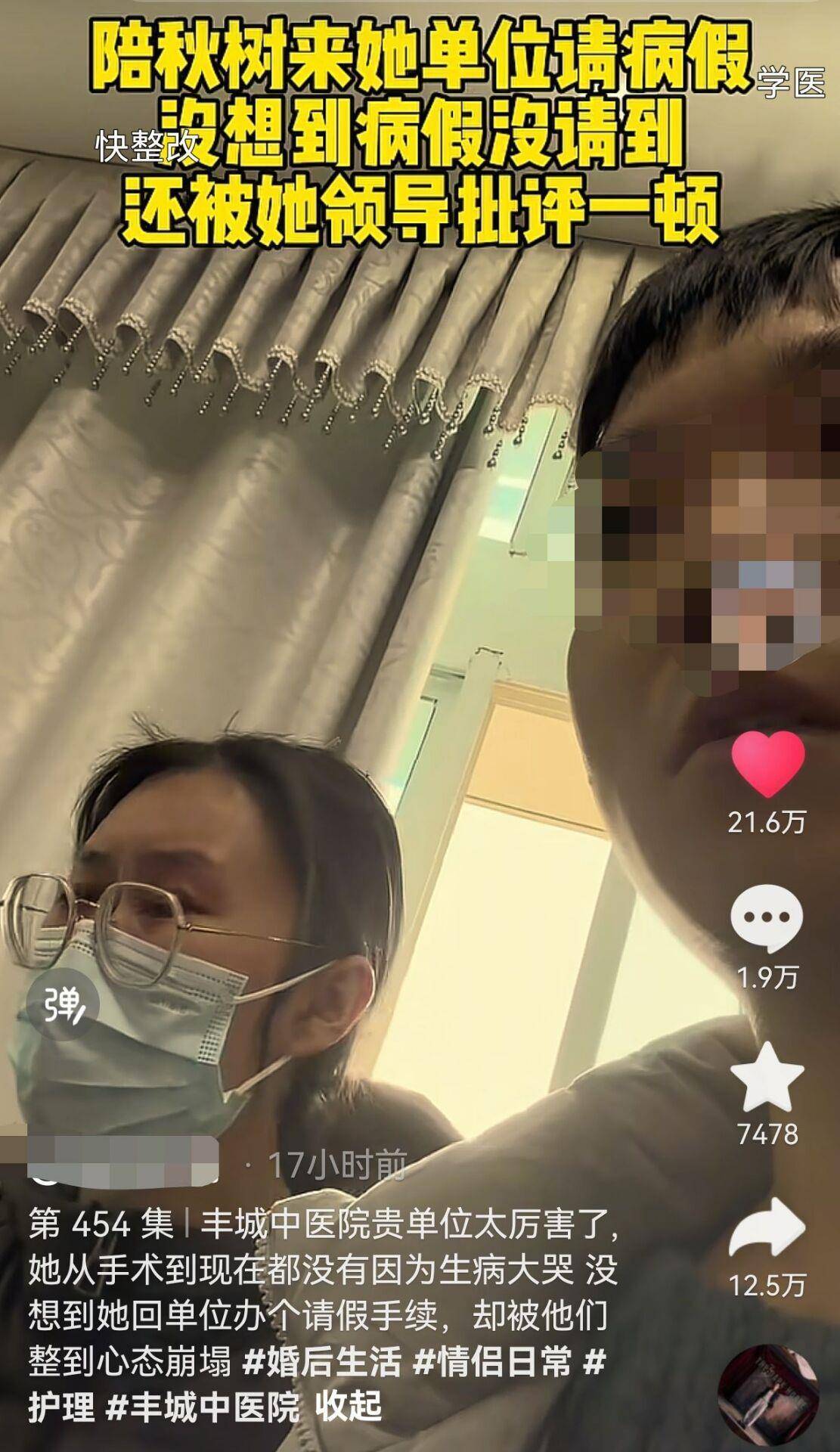 视频中还标注了文字,称她向相关领导请假后,接到了科室护理主任的电话,对方对她劈头盖脸地一顿骂和埋怨。