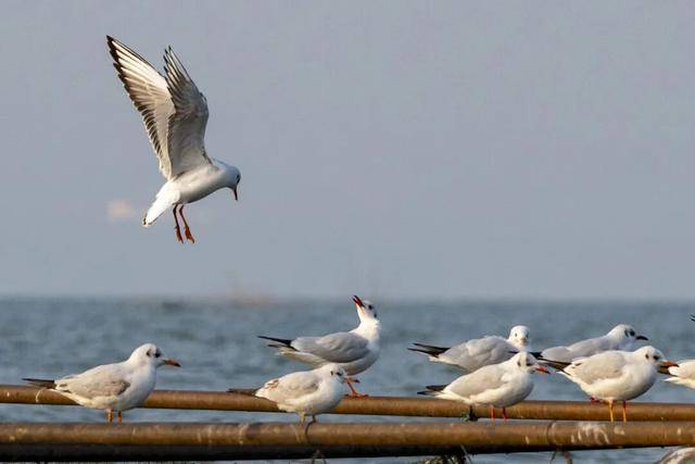 红嘴鸥,俗称水鸽子,体形和毛色都与鸽子相似,嘴和脚皆呈红色,身体大部分的羽毛是白色,尾羽黑色,是我国最常见的海鸥品种。