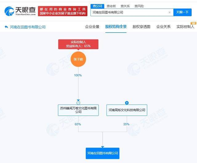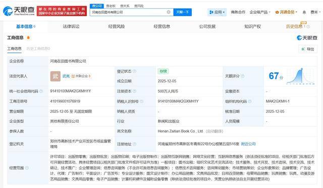 天眼查App显示,近日,河南在田图书有限公司成立,法定代表人为武亮,注册资本500万人民币,经营范围包括出版物零售、出版物批发、出版物印刷等,由张雪峰(张子彪)全资持股的苏州峰阅万卷文化图书有限公司、河南高烁文化科技有限公司共同持股。