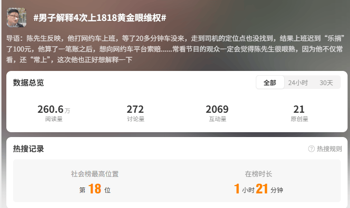 常看我们节目的观众朋友们看到陈先生可能会觉得有些眼熟,陈先生表示,他已经上过四次《1818黄金眼》了,这事今天还上了热搜。