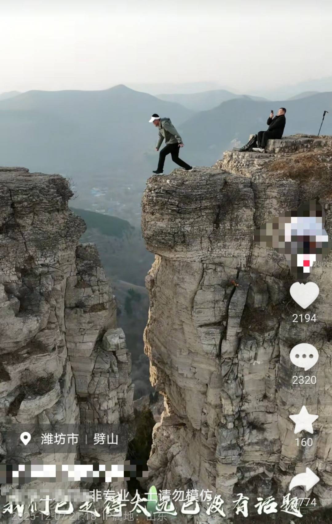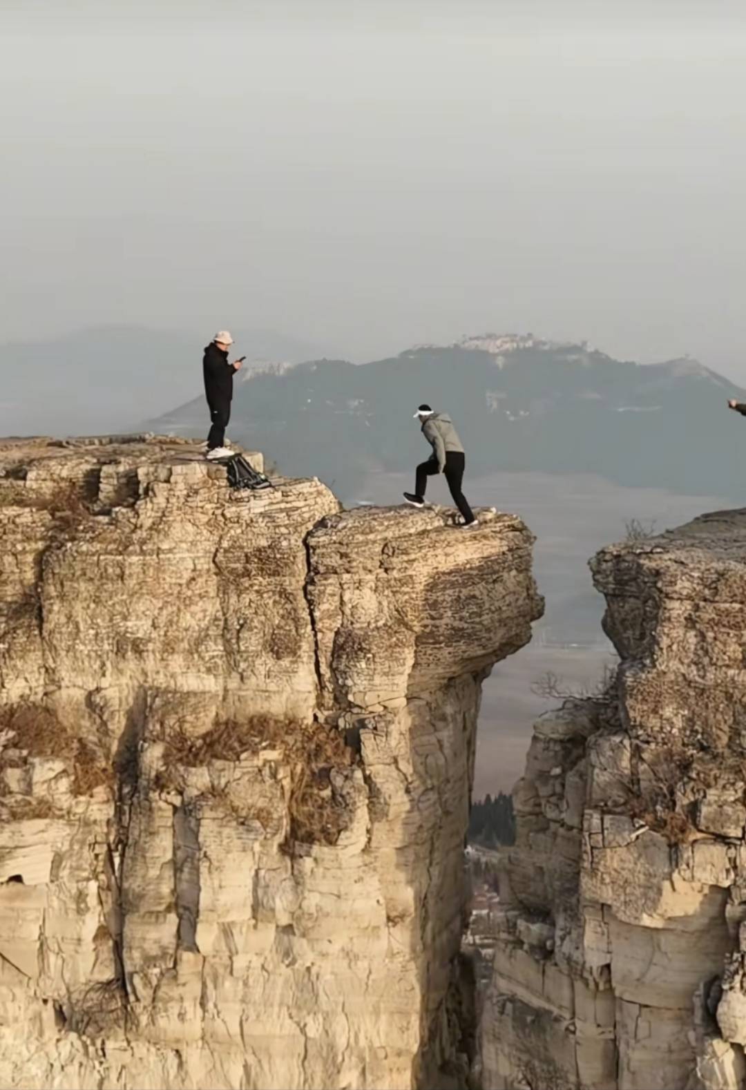 12月7日,山东潍坊,多名男子在一高崖逗留、横跳而过视频引发关注。视频显示,该高崖约10米多高、宽数米,无护栏或安全提示,一名男子横跳而过到对面,身后2男子给他拍照,对面有一名男子。很多网友担心其安全性。