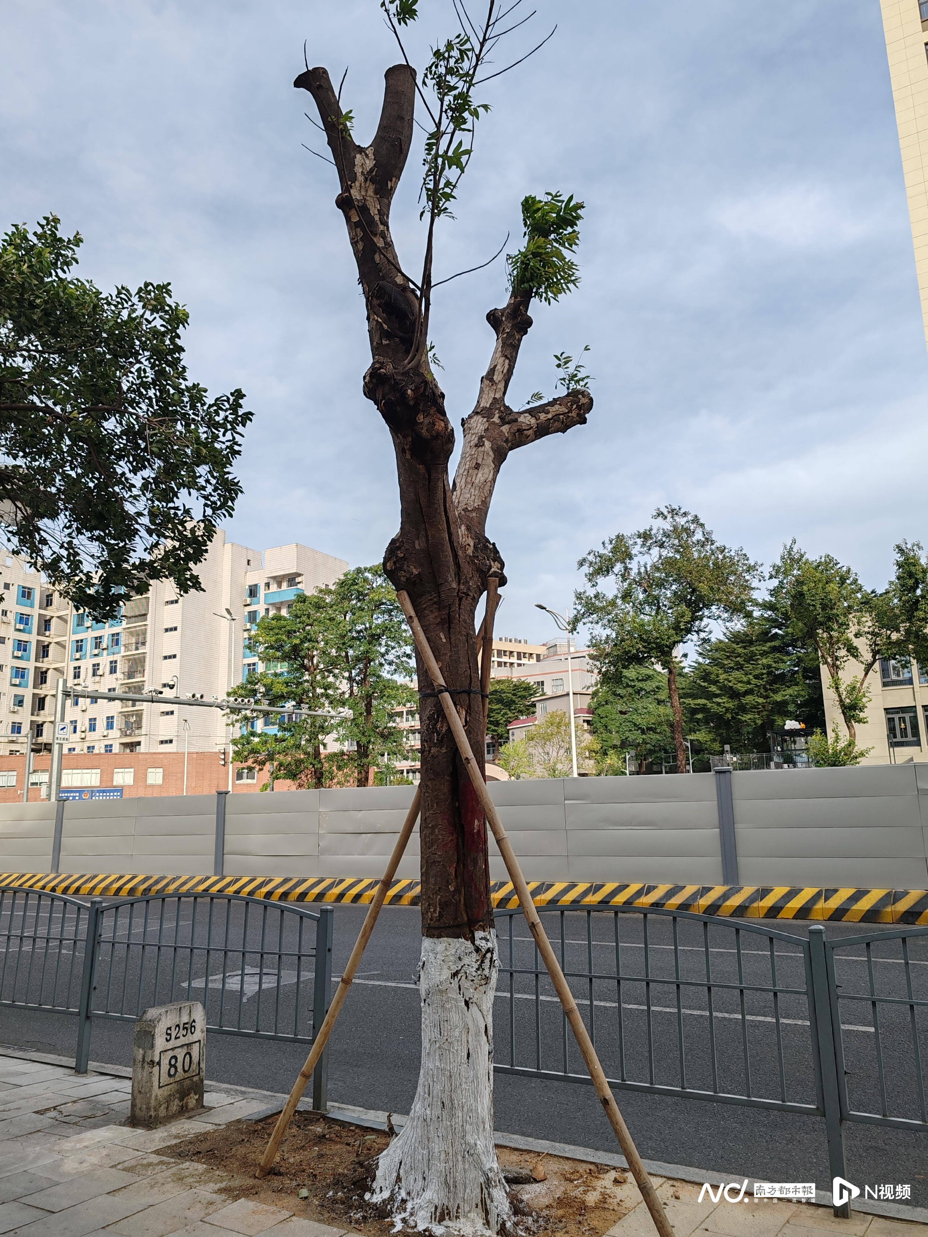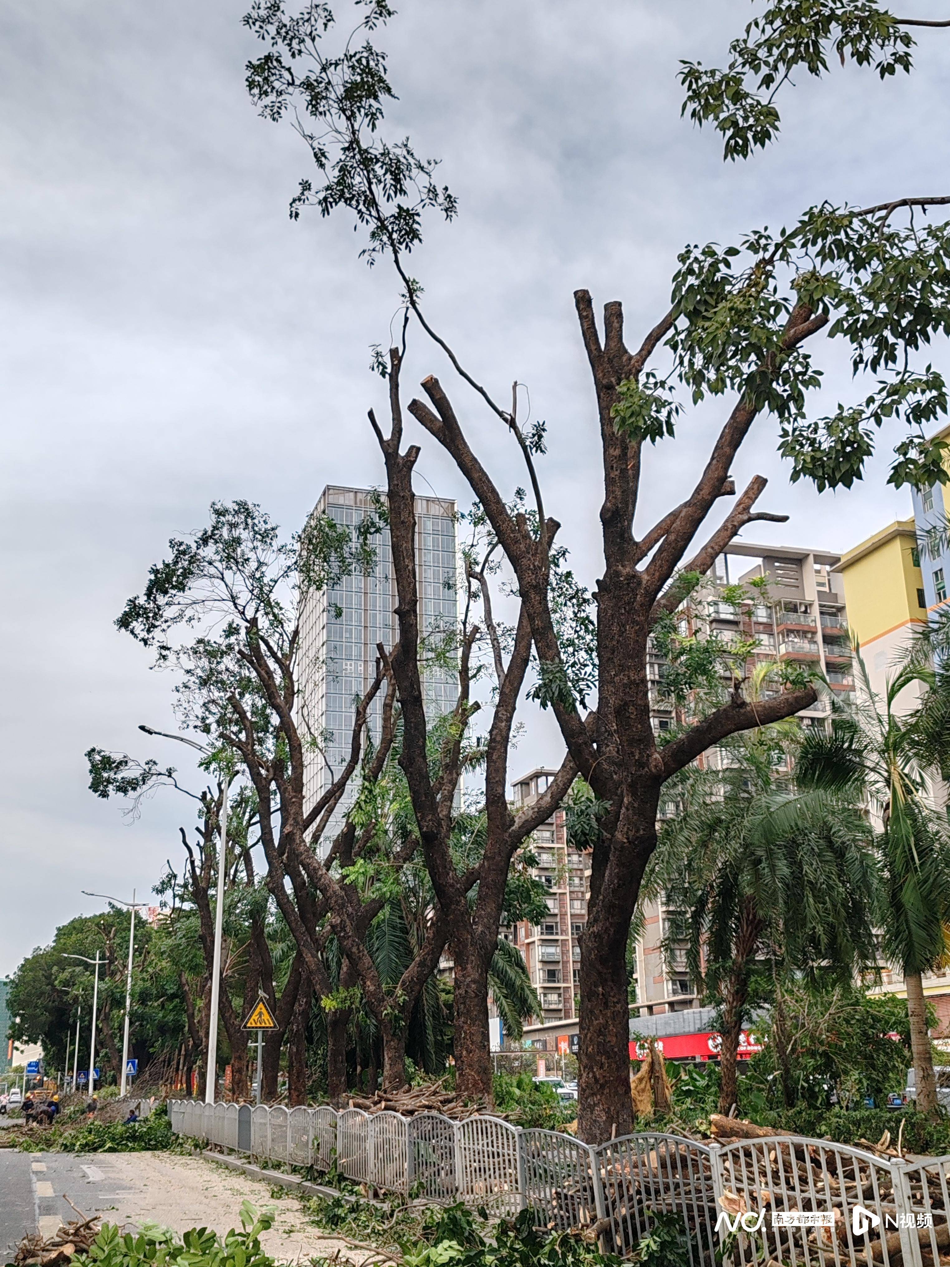 在东宝路上,同样也有多棵近期被修剪的绿化树,整体看上去显得光秃秃的,仅有少量绿色的树叶。